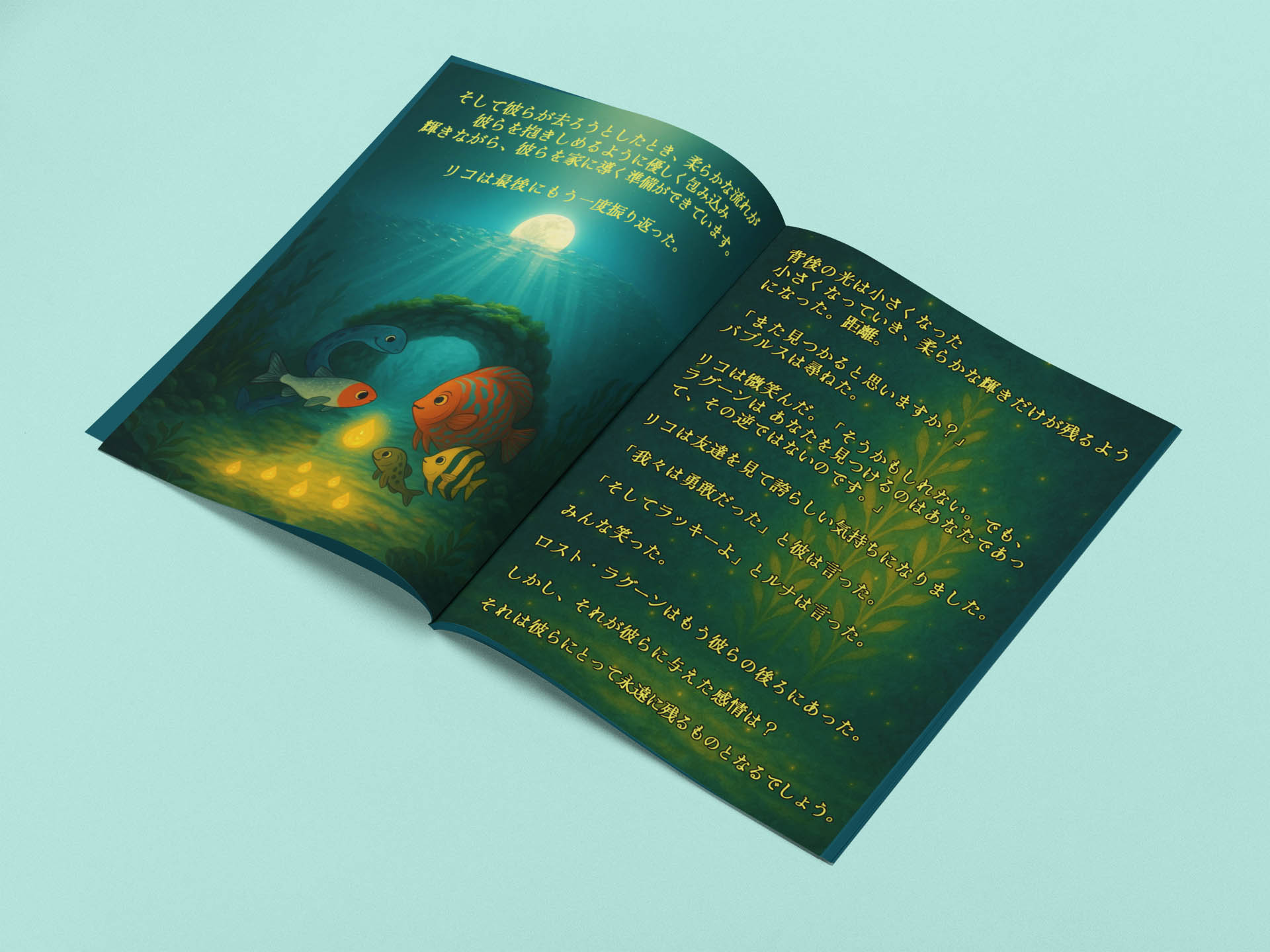 美しいイラスト – 魅惑的な水中世界を捉えた、美しく柔らかな水彩画が、ページをめくるたびに生き生きと描き出します。